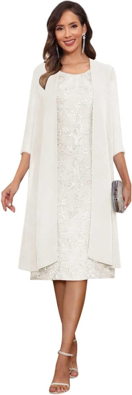 | Embellishment Feature | 2 pieces mother of the bride dress, 3/4 sleeve mother of the groom dress, Sequin Lace Mother Bride Dresses, a-line Tea Length formal dress, chiffon mother of bride dresses with jacket |