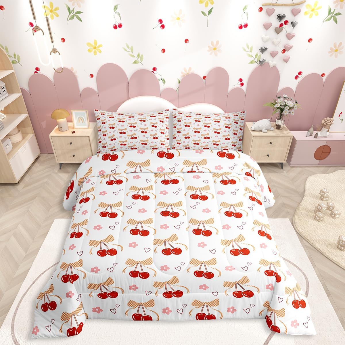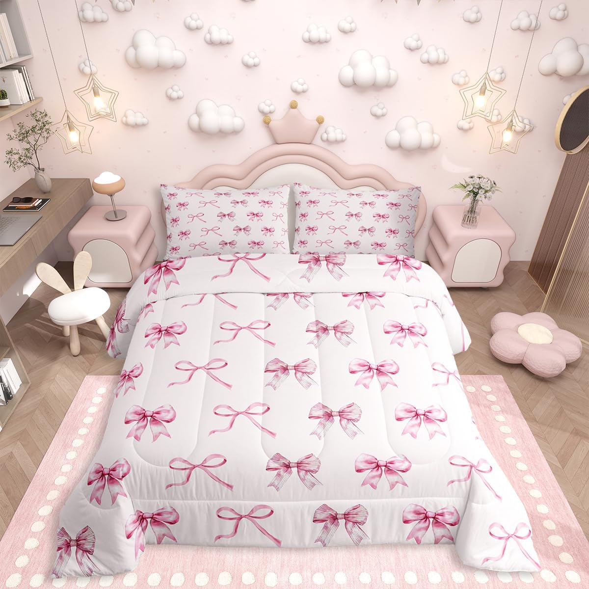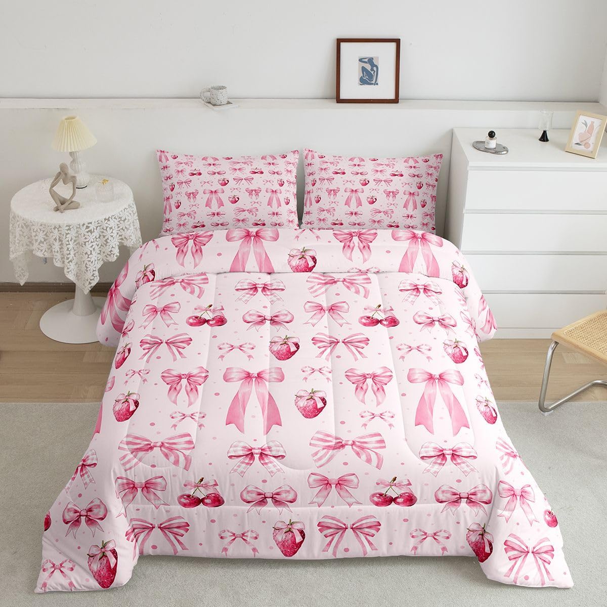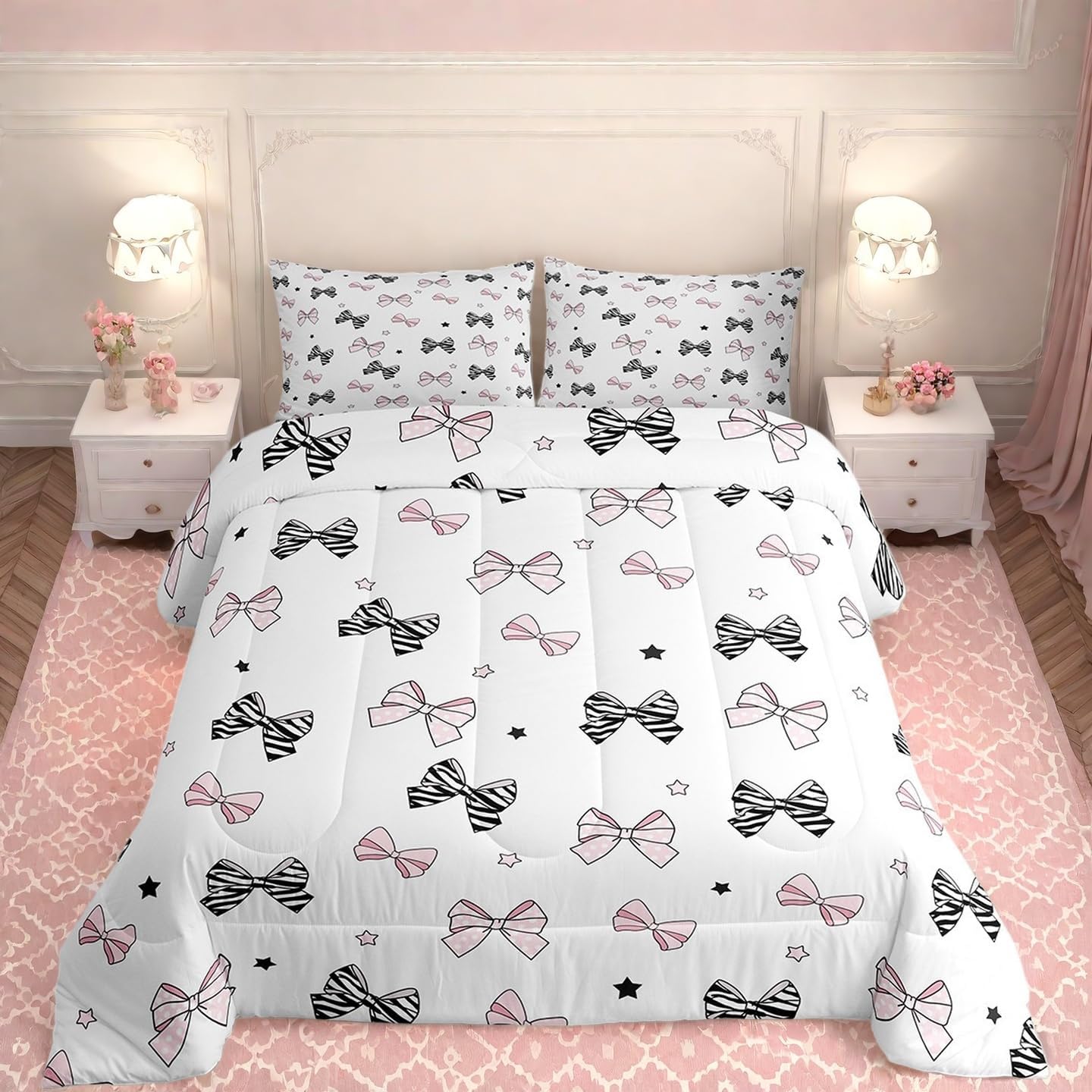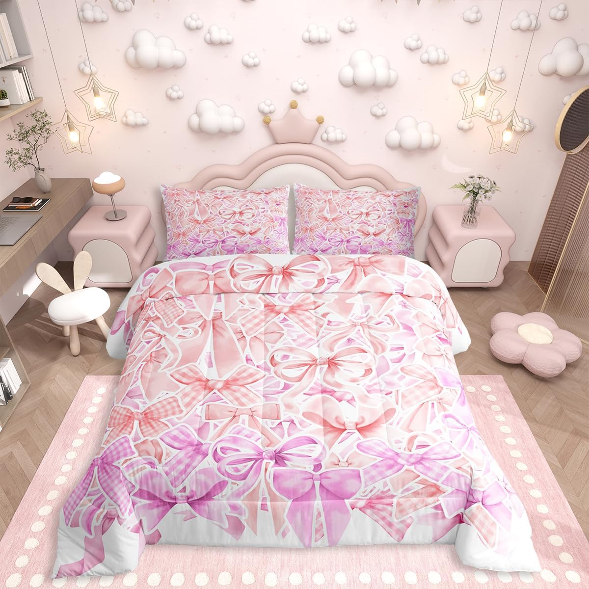 Erosebridal Light Pink Bow Bedding Set Aesthetic Bows Comforter Set,Girly Watercolor Ribbon Bowknot Quilt for Teens Kids Child Women Kawaii Princess Bowknot Quilt Kawaii Room Decor Aesthetic,Twin