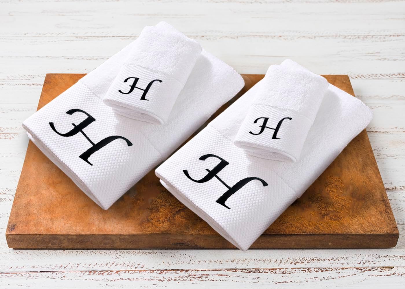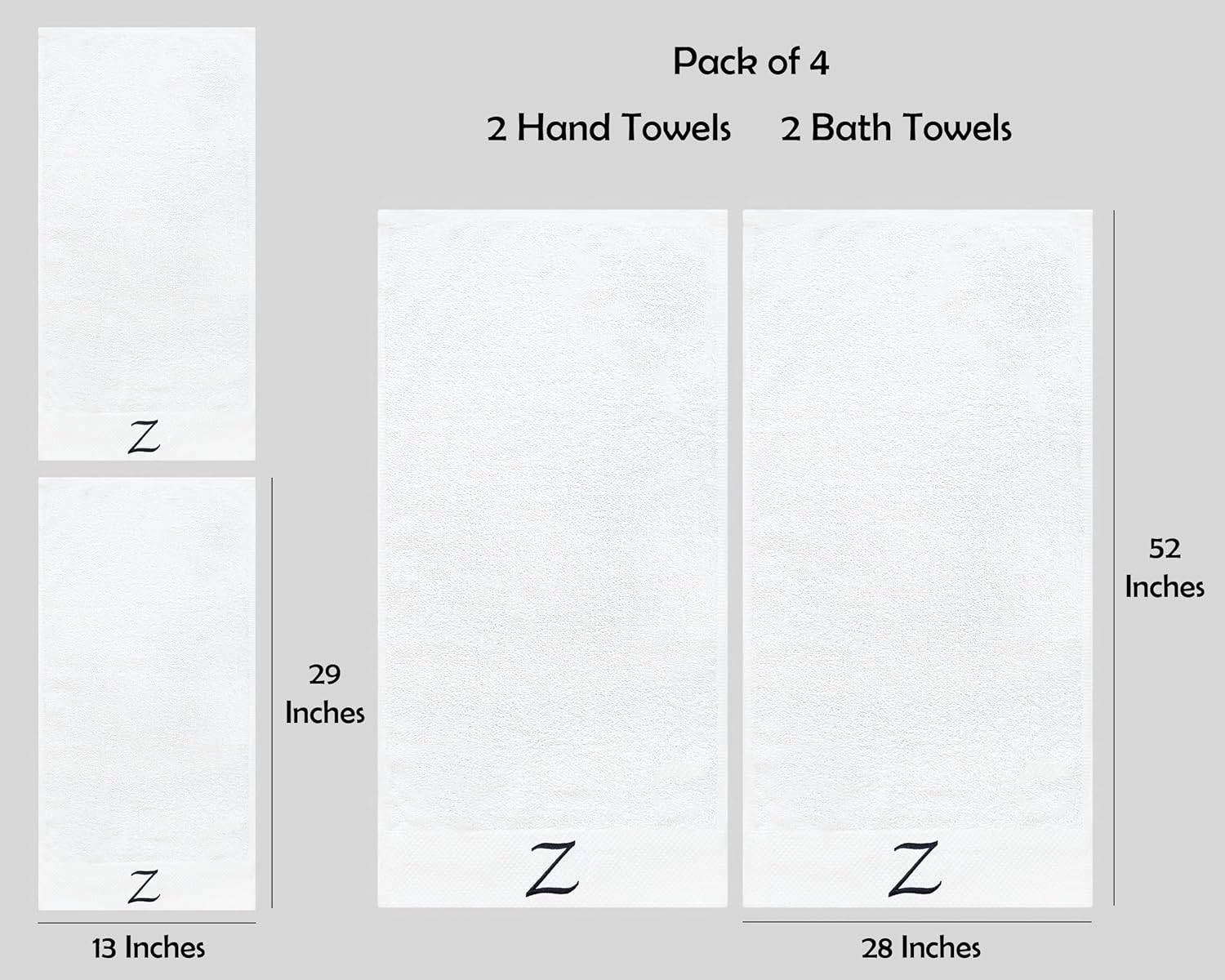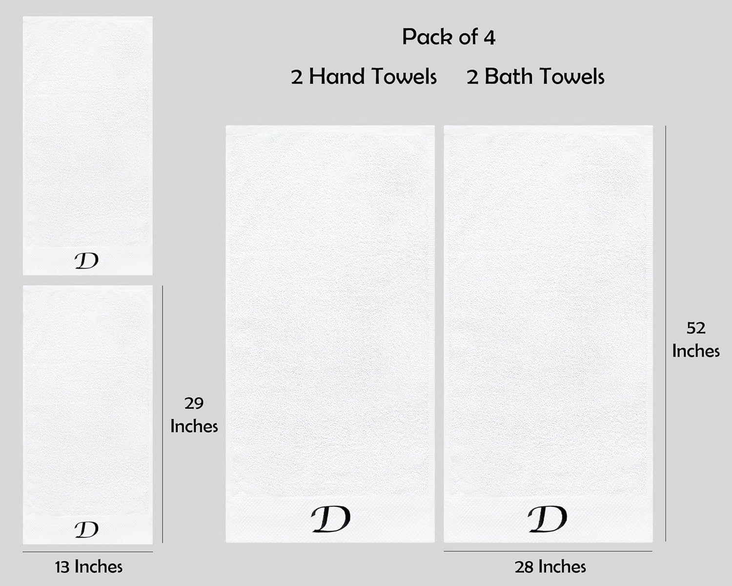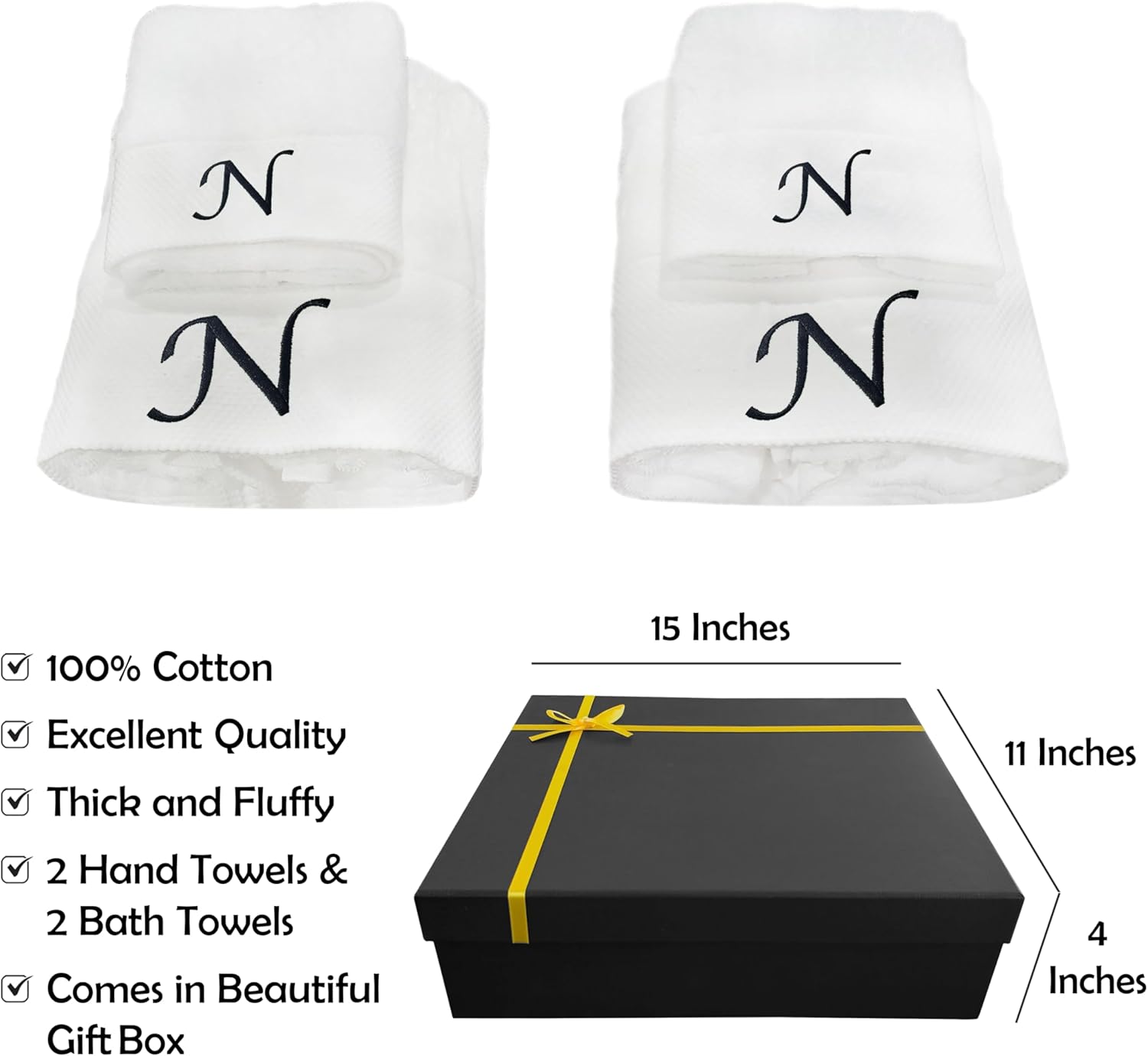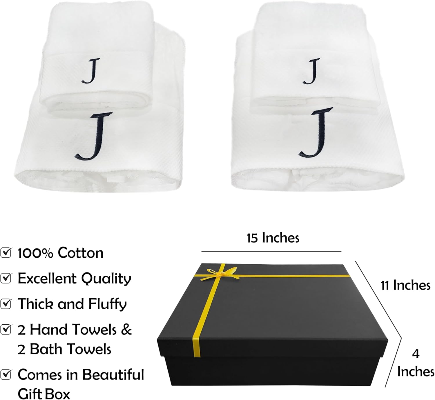 Embroidered Initial Towels Set for BathroomUnwrap a world of comfort and personalization with our exquisite set of four initial hand towels for the bathroom. Whether you're pampering yourself at home, drying off after a refreshing swim, or basking in the sun on your honeymoon, these soft embroidered towels ensure a touch of elegance in every moment and will transform your daily shower routine into a spa-like experience. Moreover, they will elevate your bathroom décor, adding a touch of elegance that speaks about your style.Hand towels set features a custom monogram, embroidered with your initials to create a truly unique and personal touch. Presented in a beautiful gift box, this monogrammed towel set makes a thoughtful and unforgettable present for any occasion. Surprise couples, families, and friends with a gift that combines practicality with a touch of luxury.Comfy Quick-drying TowelsThe monogrammed towels for bathroom are made from high-quality cotton that allows for superior absorbency, so you won't be left feeling damp. These are durable and will retain their exceptional softness and absorbency even after repeated washing, providing comfort for years.Easy Washing for Lasting UseThis bath and hand towel set is suitable for machine washing ideally under cool water, wash separately with like colors. With proper care, these white bathroom towels will continue to envelop you in luxury for years to come.Gift Box Contains2x Bath Towels (28 x 52 inches)2x Hand Towels (13 x 29 inches)