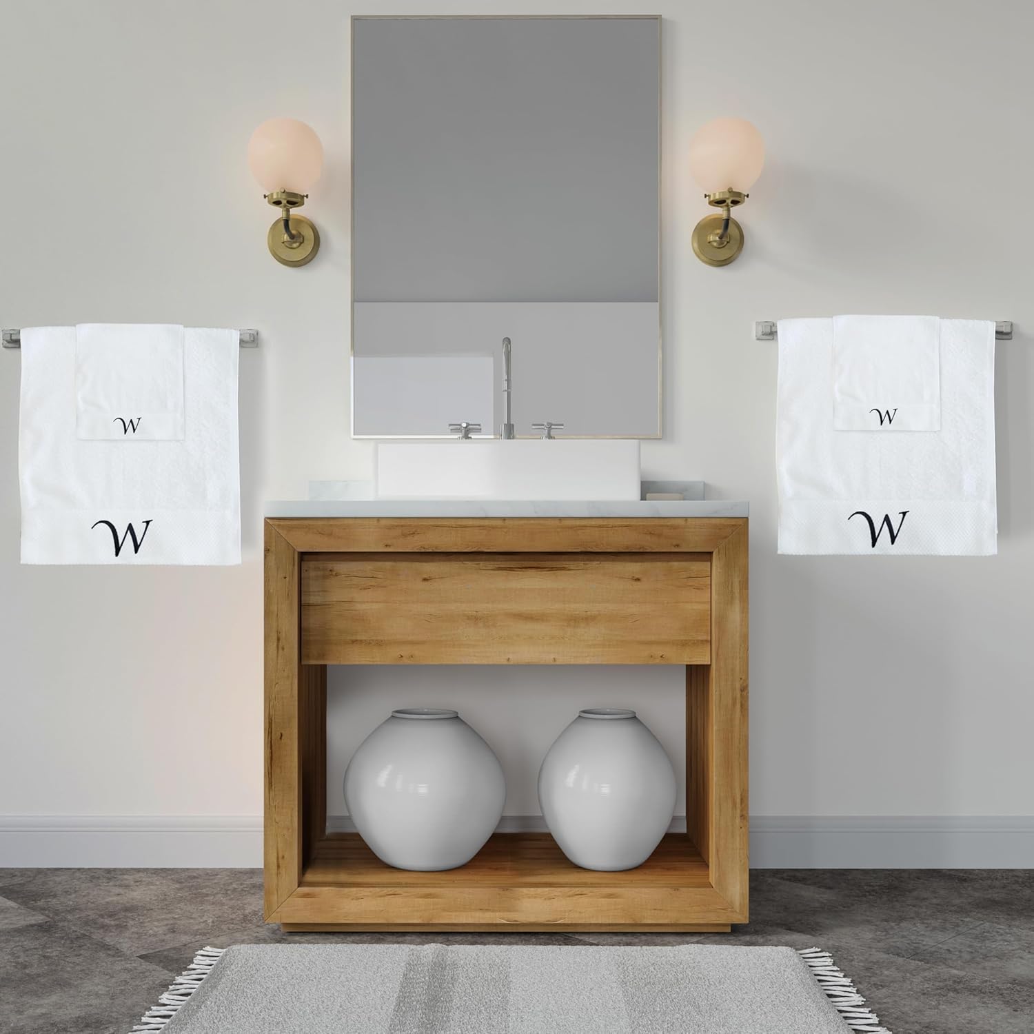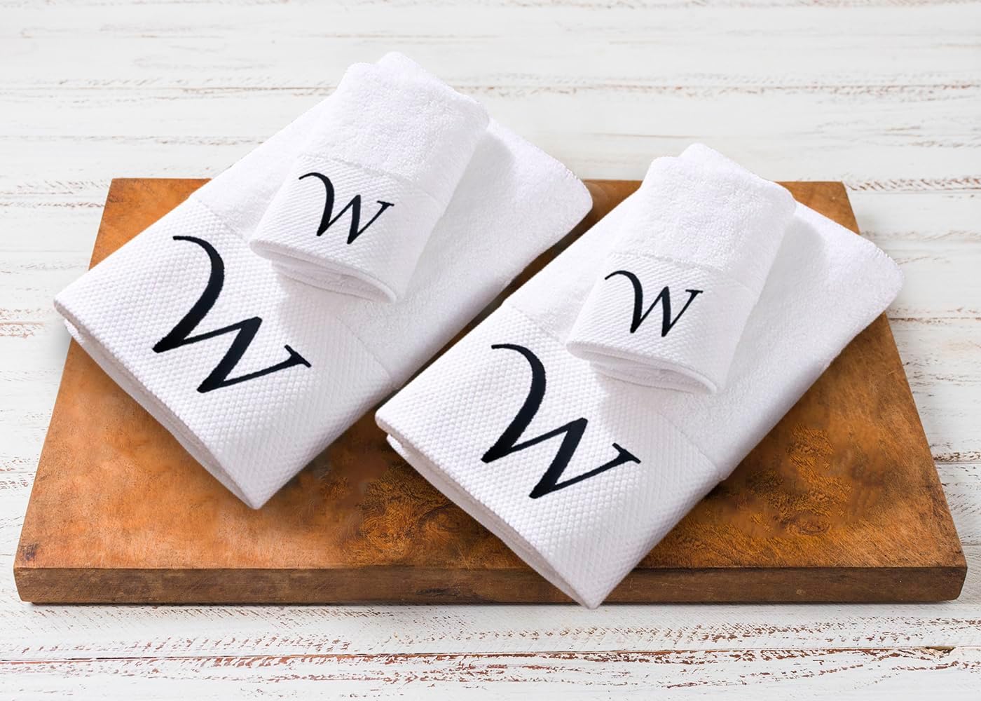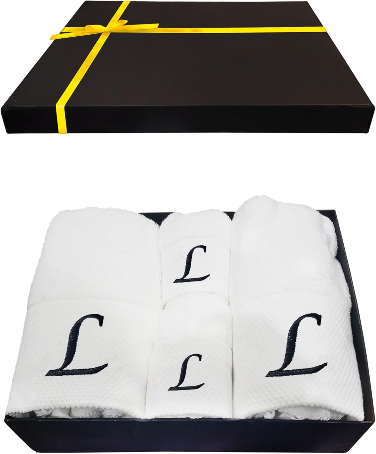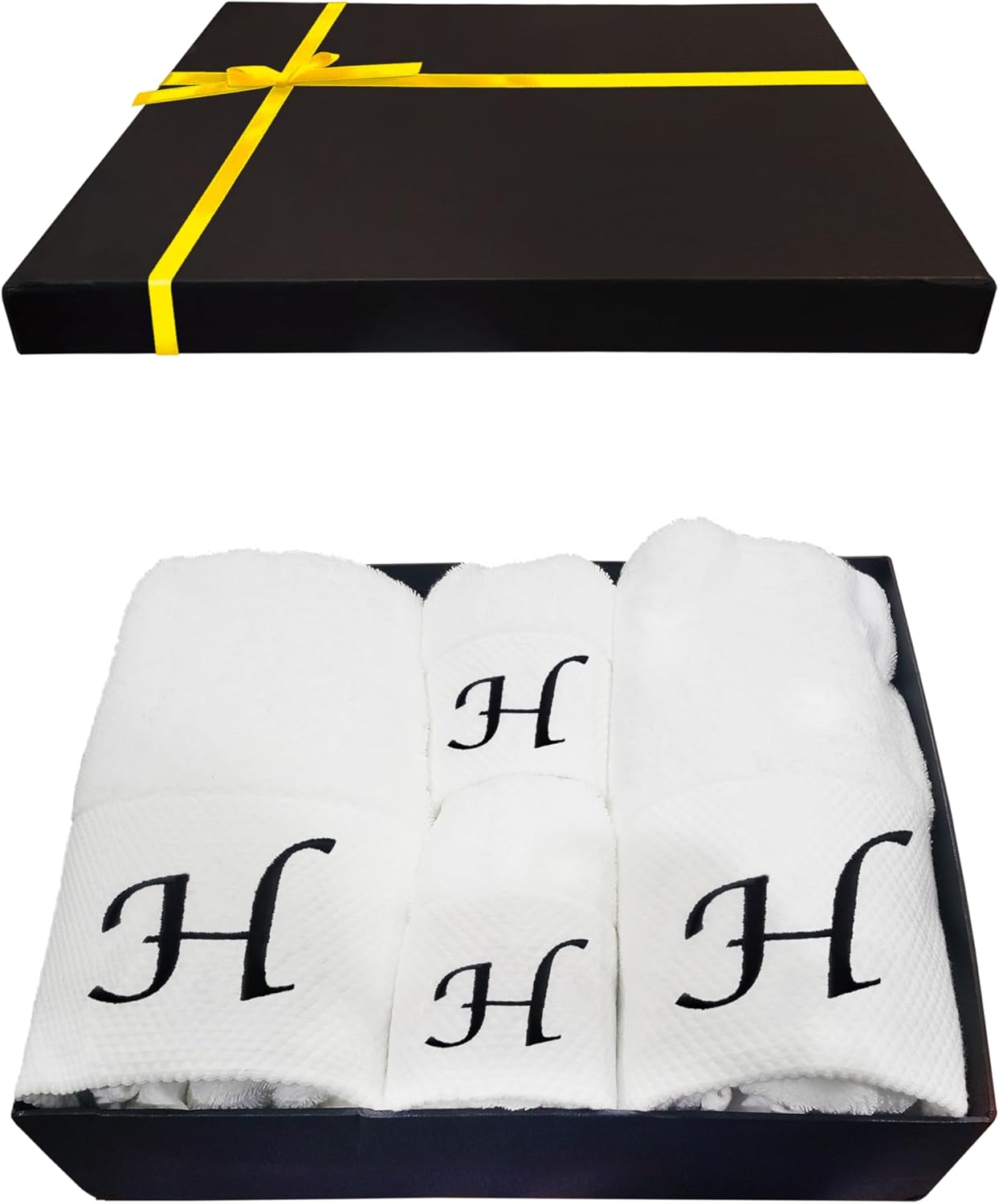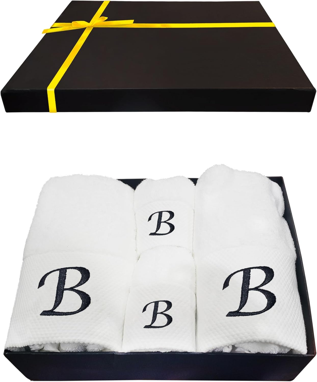 Embroidered Initial Towels Set for BathroomUnwrap a world of comfort and personalization with our exquisite set of four initial hand towels for the bathroom. Whether you're pampering yourself at home, drying off after a refreshing swim, or basking in the sun on your honeymoon, these soft embroidered towels ensure a touch of elegance in every moment and will transform your daily shower routine into a spa-like experience. Moreover, they will elevate your bathroom décor, adding a touch of elegance that speaks about your style.Hand towels set features a custom monogram, embroidered with your initials to create a truly unique and personal touch. Presented in a beautiful gift box, this monogrammed towel set makes a thoughtful and unforgettable present for any occasion. Surprise couples, families, and friends with a gift that combines practicality with a touch of luxury.Comfy Quick-drying TowelsThe monogrammed towels for bathroom are made from high-quality cotton that allows for superior absorbency, so you won't be left feeling damp. These are durable and will retain their exceptional softness and absorbency even after repeated washing, providing comfort for years.Easy Washing for Lasting UseThis bath and hand towel set is suitable for machine washing ideally under cool water, wash separately with like colors. With proper care, these white bathroom towels will continue to envelop you in luxury for years to come.Gift Box Contains2x Bath Towels (28 x 52 inches)2x Hand Towels (13 x 29 inches)