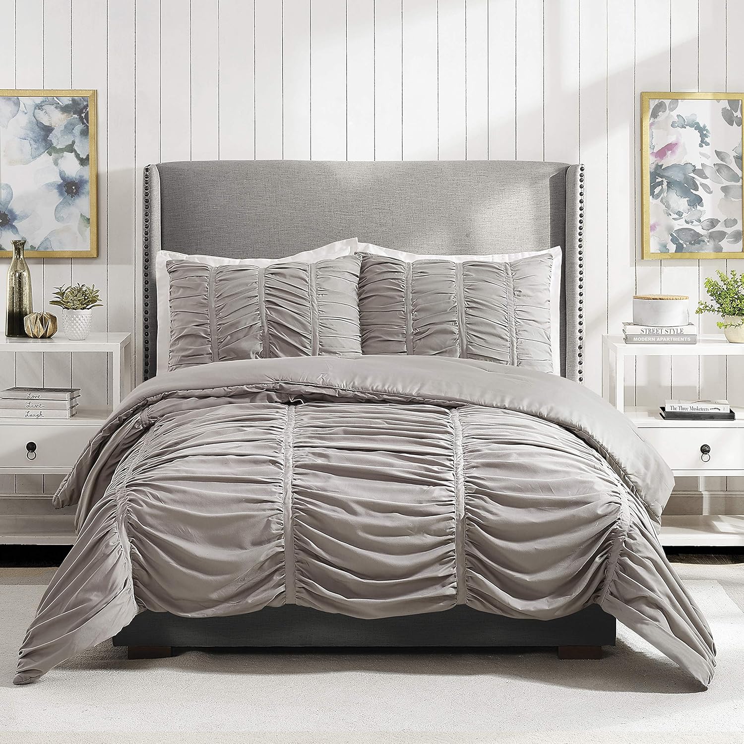 This Modern Heirloom comforter set comes in a range of fashionable solid colors, and it’s finished with elegant ruched effect. This gathered technique creates volume and is airy and casual all at once. It is a great addition to any bedroom.
